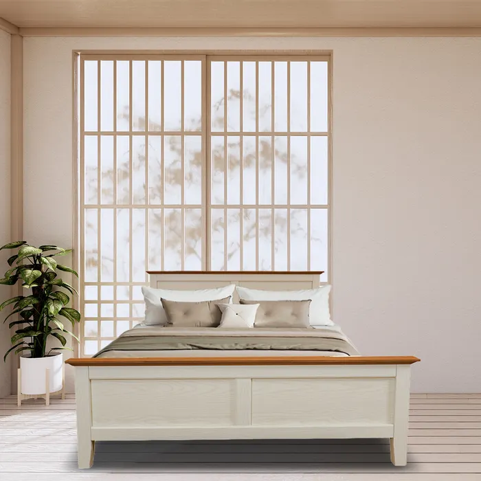 เตียง 3.5 ฟุต (กxยxส: 126x212x90) รุ่น GANSO สีขาวตัดสีไม้ เตียงในคอลเลคชันสไตล์ญี่ปุ่น ดีไซน์สวยงามเป็นเอกลักษณ์ ใต้เตียงแบบโล่ง สามารถทำความสะอาดได้ง่าย