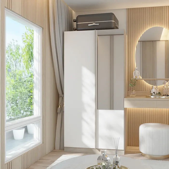 ตู้เสื้อผ้าบานเปิด ขนาด กxยxส: 100x56x200 ซม. ซม. รุ่น CADEN-A สีโซลิดโอ๊ค ตัดกับหน้าบานสีขาว มีกระจกเงา ภายในตู้แบ่งเป็นสัดส่วน และมีช่องเก็บของพร้อมกุญแจล็อค