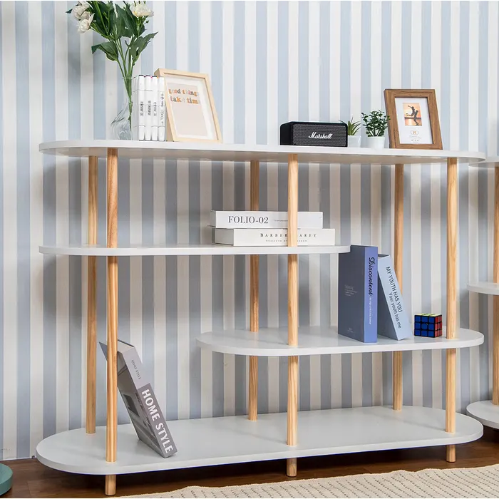 ชั้นวางของ ขนาด กxยxส: 120x35x80 ซม. รุ่น GIBSON ชั้นวางสีขาว 4 ชั้น ดีไซน์โค้งมน ตัดกับเสาไม้จริงสีธรรมชาติ สามารถเข้าได้กับทุกสไตล์การตกแต่งห้อง
